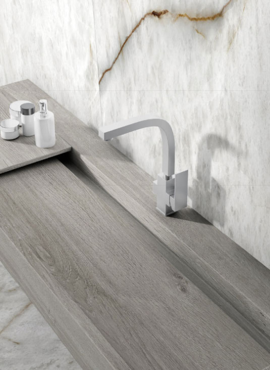 - Lżejszy niż wiele okładzin i powierzchni stosowanych we wnętrzach, Neolith jest dostępny w różnych grubościach, w tym w ultracienkiej wersji 3 mm